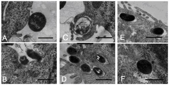 Electron microscopic identification of the initial steps in the invasion of eukaryotic cells by Serratia grimesii. (A) Tight contact of bacteria with HeLa M cells. (B) Extensive contact of bacteria with the surface of the host cell followed by the entry of bacteria into the host cell, which corresponds to the zipper mechanism of invasion. (C,D) Appearance of host cell filopodia, whose fusing traps bacterium and places it inside the vacuole, which corresponds to the trigger mechanism. (E) Bacteria live in the vacuoles. (F) Bacteria leave the vacuole to live free in the host cell cytoplasm. Scale bars, 1 µm. (Modified from [50] with permission from Pleiades Publishing, Ltd. 117342, 2020.).