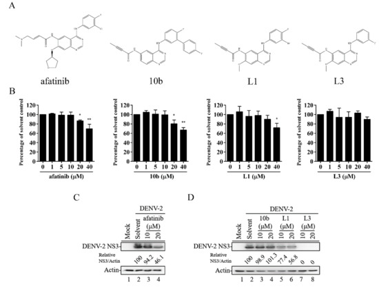 Molecular structures and antiviral abilities of a series of afatinib-derivative tyrosine kinase inhibitor (TKI) compounds. (A) Schematic structures of afatinib and compounds 10b, L1, and L3. (B) HEK-293 cells were treated with a solvent or with different concentrations of afatinib and compounds 10b, L1, and L3 for 36 h. The WST-1 assay was used to measure cell viability. A percentage was obtained by comparison with the solvent control, set at 100%. (C,D) HEK-293 cells infected with dengue virus (DENV)-2 (multiplicity of infection (MOI) = 1) and treated with afatinib (C) or with compounds 10b, L1, and L3 (D) at 10 and 20 μM. After 36 h, a Western blot analysis of viral protein levels in the cell lysates was performed, and the ratio of the viral NS3 protein level to the level of actin was adjusted to that of the solvent control. Data are the mean ± SD of three independent experiments. * p < 0.05, ** p < 0.01 according to a two-tailed Student’s t-test.
