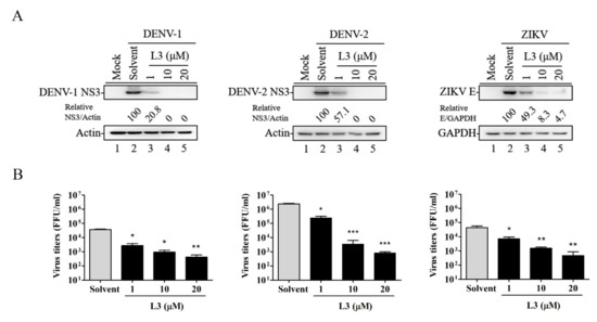 Antiviral activities of compound L3 against DENV-1, DENV-2, and ZIKV in HEK-293 cells. HEK-293 cells were infected with DENV-1, -2, or ZIKV with or without (solvent) various concentrations of compound L3 for 36 h. (A) Viral protein levels were determined by Western blot analysis. Actin or GAPDH was used as a loading control. Relative ratios of viral NS3 or E protein levels to actin or GAPDH levels were adjusted to those of the solvent control. (B) The viral progeny production in the culture supernatants was measured by a focus-forming assay. Data are the mean ± SD of three independent experiments. * p < 0.05, ** p < 0.01, *** p < 0.001 according to a two-tailed Student’s t-test.