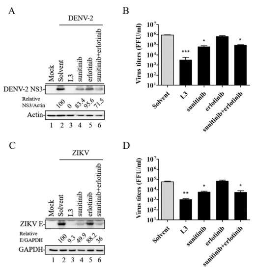 We also compared the therapeutic efficacy of compound L3 with that of other TKIs (either alone or in combination). Notably, at 10 μM, there were significant reductions in viral proteins and virus titers in DENV-2- and ZIKV-infected HEK-293cells treated with compound L3 compared to those that underwent sunitinib or erlotinib monotreatment or erlotinib plus sunitinib combination treatment (Figure 3). Thus, compound L3 may be used (either alone or synergistically with other TKIs) to provide superior treatment against flaviviral infections in the future, especially in concurrent DENV and ZIKV epidemic outbreaks.