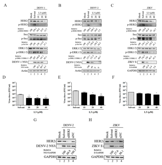 Compound L3 suppressed DENV and ZIKV replication through the HER2 signaling pathway. (A–C) MCF-7 cells were infected with DENV-1 for 36 h (A), DENV-2 for 30 h (B), or ZIKV for 36 h (C) (MOI = 1) and treated with 10, 20, or 40 μM of compound L3 to monitor the phosphorylation of HER2, Src, and ERK1/2 signaling molecules by Western blotting. Relative ratios of p-HER2, p-Src, and p-ERK1/2 levels to HER2, Src, and ERK1/2 levels were adjusted to those of the mock control. Viral protein levels were also determined by Western blot analysis. The relative ratios of viral NS3 or E protein levels to actin or GAPDH levels were adjusted to those of the solvent control. Actin or GAPDH was used as the loading control. (D–F) Viral titers in culture supernatants were measured by a focus-forming assay. Data are the mean ± SD of three independent experiments. * p < 0.05, ** p < 0.01 by a two-tailed Student’s t-test. (G,H) MCF-7 cells were transiently transfected with an siRNA-HER2 (siHER2) or an siRNA negative control (siNC). At 24 h after transfection, the cells were infected with DENV-2 (G) or ZIKV (H) (MOI = 1) for 24 h and lysed for Western blot analysis. GAPDH was used as a loading control. The relative ratios of viral NS3 or E protein levels to GAPDH levels were adjusted to those of the solvent control.