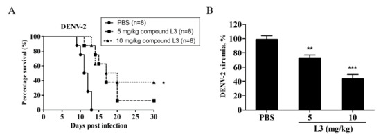 All animal experiments were carried out according to the guidelines outlined by the Council of Agriculture, Executive Yuan, Republic of China, in adherence with the Declaration of Helsinki and U.S. National Institute of Health Guidelines for the treatment of laboratory animals. The animal protocol was approved by the Institutional Animal Care and Use Committee (IACUC) of the National Defense Medical Center (permit no. IACUC-18-158). To examine the therapeutic efficacy of compound L3 against DENV-2 in vivo, AG129 mice were divided into three groups for treatment (n = 8 per group): (1) intraperitoneal (i.p.) injection with 108 focus-forming units (FFU) of DENV-2 and PBS (vehicle control); (2) i.p. injection with 108 FFU of DENV-2 followed by oral administration of 5 mg/kg of compound L3; and (3) i.p. injection with 108 FFU of DENV-2 followed by oral administration of 10 mg/kg of compound L3. AG129 mice received the same dose daily for 7 days. The survival of the mice was monitored daily for 30 days. For viremia detection, serum samples were collected on day 3 post-infection, and viral titers were measured using a focus-forming assay.