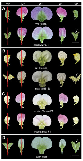 Phenotypes of the cochleata (coch) and symmetric petals (syp1) mutants in pea. (A) Petals of the wild type (JI116) and the coch mutant (JI2757) possess dorsal-ventral (DV) differentiation. (B) Petals of the wild type (Terese) and the syp1 mutant (JI2757) possess DV differentiation. (C) Petals of the F1 plants (coch × Terese, coch × syp1) possess DV differentiation. (D) Petals of the coch syp1 double mutant possess DV differentiation. The red lines indicate the internal (IN) asymmetry and the dotted lines indicate the abolishment of IN asymmetry. The arrows indicate the cutting at the ventral petals so as to flatten the petals. DP, the dorsal petal; LP, the lateral petal; VP, the ventral petal. (A–D) Scale bar = 1 cm.