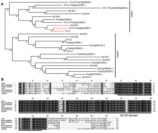Phylogenetic analysis and sequence alignments of ALOG proteins. (A) The neighbor-joining tree of members of the ALOG gene family in pea and Arabidopsis. The bootstrapping value is located in each node as percentages along the branches. Red line indicates the branch including AtLSH3, SYP1 and SYL1. (B) The alignment of SYP1, SYL1, Medtr1g069825, Medtr7g097030, Lj5g3v1083950, Lj1g3v4515410, and AtLSH3 proteins using full-length amino acid sequences. The ALOG domain is indicated by a black line.