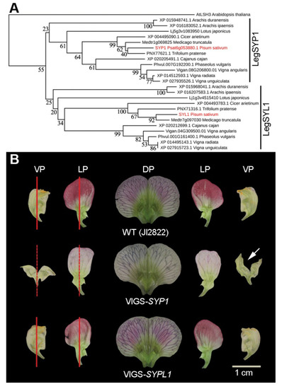 Phylogenetic analysis of LSH3 orthologs in legumes. (A) The neighbor-joining tree of AtLSH3 orthologs in legume plants. The bootstrapping value is located in each node as percentages along the branches. Red lines indicate two proteins in pea, SYP1 and SYL1. (B) The lateral petals and ventral petals of the wild type and VIGS-SYP1 and VIGS-SYL1 silenced plants. The red lines indicate the IN asymmetry and the dotted lines indicate the abolishment of IN asymmetry. The arrow indicates where the ventral petal was cut to flatten the petal. DP, dorsal petal; LP, lateral petal; VP, ventral petal.