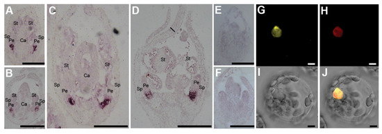 Spatiotemporal expression pattern and subcellular localization of SYP1. (A,C) SYP1 gene expression was detected in developing flowers. (B,D) COCH gene expression was detected in developing flowers. (E,F) The SYP1 and COCH sense probes were used as the negative controls. No hybridization signal was detected in developing flowers. St, Stamen; Sp, Sepal; Pe, Petal; Ca, Carpel. (A–F) Scale bars = 100 μm. (G–J) Subcellular localization of SYP1 fusion proteins in mung bean protoplasts by YFP or mCherry fluorescence. The fluorescent fusion proteins were expressed in mung bean protoplasts and visualized by confocal microscopy. (G–J) Subcellular localization analysis of SYP1-YFP together with the nuclear marker OsARF4-mCherry. The cells were analyzed for yellow fluorescence emission, mCherry fluorescence emission, and under bright-field illumination 12 h after transformation. Scale bar = 5 μm.