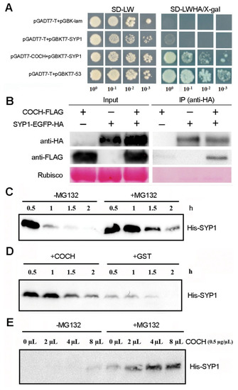 COCH interacted with SYP1. (A) Yeast two-hybrid assays for COCH and SYP1. The bait protein was expressed as a binding domain fusion and the indicated prey proteins were expressed as activating domain fusions in yeast AH109 cells. Transformed yeast was grown on selective media lacking Leu and Trp (-2) or lacking Ade, His, Leu, and Trp (-4) plus X-α-Gal to test protein interaction. 100, 10−1, 10−2 and 10−3 represent dilution series. (B) COCH was co-immunoprecipitated with SYP1. (C) Degradation assay of His-SYP1 performed in a pea cell-free system with or without MG132. (D) Degradation assay of His-SYP1 performed in a pea cell-free system with COCH or GST. (E) Degradation assay of His-SYP1 performed in a pea cell-free system with or without MG132 and different amounts of COCH.