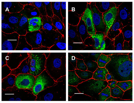 In Fisher rat thyroid (FRT) cells, overexpressed His-tagged TMEM16E, TMEM16H, TMEM16J and TMEM16K, were located in membranes of intracellular compartments (Figure 1). Two different strategies were used to target these TMEM16 paralogs to the plasma membrane. As a first strategy, we fused the cytosolic N- and C-terminal parts of TMEM16A to the transmembrane domains of TMEM16E and TMEM16K. To visualize expression of these chimeras in living human embryonic kidney (HEK293) cells, the constructs were tagged with green fluorescent protein (GFP). However, these chimeras were still expressed intracellularly (Figure 2A,B). As a second strategy, we added the cyan fluorescent protein (CFP) to the CAAX motif sequence (KKKKSKTKCVIM) from Rho GTPase and fused both to the carboxyl terminus of TMEM16E, TMEM16H, TMEM16J and TMEM16K. It was shown by Agarwal et al. [20] that the CAAX motif targets the cAMP sensitive biosensor Epac2 specifically to non-lipid raft domains of the plasma membrane. At the C-terminus, CAAX proteins contain a specific recognition site (CAAX motif/box) for prenylation, a post-translational modification process. Due to prenylation, 15-carbon farnesyl groups or 20 carbon isoprenoids are added to the cysteine residues of the CAAX box [21]. Indeed, this translational modification guided TMEM16E-CFP-CAAX, TMEM16H-CFP-CAAX, TMEM16J-CFP-CAAX and TMEM16K-CFP-CAAX to the plasma membrane (Figure 2C–G).