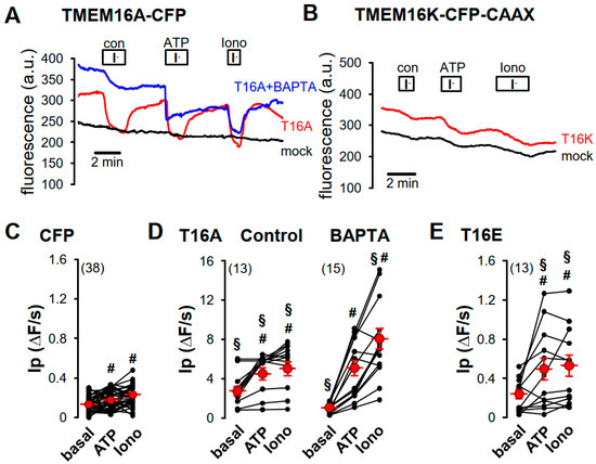 Supplementary materials can be found at https://www.mdpi.com/1422-0067/21/11/4065/s1, Figure S1: HEK293-YFP cells were transfected with (A) TMEM16A-CFP, (B) TMEM16E-CFP-CAAX, (C) TMEM16H-CFP-CAAX, (D) TMEM16J-CFP-CAAX and (E) TMEM16K-CFP-CAAX. An excitation wavelength of 485 nm was used to measure YFP-fluorescence, whereas an excitation wavelength of 440 nm was used to identify plasma membrane-targeted TMEM16E/-H/-J/-K-expressing cells by CFP-fluorescence. Fluorescence emission was measured at 520–540 nm. Bar 10 µm.