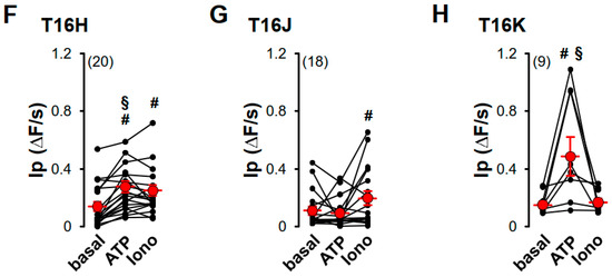 Increased iodide permeability induced by TMEM16 proteins was sensitive to tannic acid. (A) Ionomycin-induced iodide permeability (Ipionomycin) from TMEM16E-CFP-CAAX (T16E)-, TMEM16H-CFP-CAAX (T16H)- or TMEM16J-CFP-CAAX (T16J)-expressing HEK293 cells was measured under control (con) or after pre-incubation with tannic acid (TA, 20 µM) for 3 min. (B) ATP-induced iodide permeability (IpATP) of TMEM16K-CFP-CAAX was measured under control (con) or after pre-incubation with tannic acid (TA, 20 µM) for 3 min. (Number of cells measured), § unpaired t-test, α < 0.05.