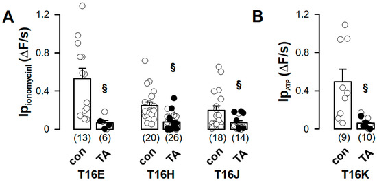 Anion permeability of TMEM16 proteins was determined in yellow fluorescence protein (YFP)-quenching assays using HEK293 cells stably expressing the iodide sensitive yellow fluorescent protein I152L (YFP) [22]. Validation of the YFP assay by the C-terminal CFP-tagged Ca2+-activated chloride channel TMEM16A (TMEM16A-CFP) showed fluorescence quenching after application of iodide (I−), upon stimulation with 100 µM ATP and in the presence of the Ca2+ ionophore ionomycin (Iono, 1 µM) (Figure 3A). The initial decrease of the YFP fluorescence by iodide (initial slope, ΔF/s) correlated to the iodide permeability (IP) and is summarized in Figure 3D. Compared to CFP-transfected cells (Figure 3C, mock), the basal iodide quenching was increased in TMEM16A-CFP-expressing cells, and was increased by ATP or ionomycin (Figure 3D). Pre-incubation of the cells for 30 min with the Ca2+-chelator BAPTA significantly decreased basal IP and slightly increased the effect of ionomycin, due to increased sensitivity of unstimulated TMEM16A (Figure 3A,D). Expression of the TMEM16-CFP-CAAX proteins in HEK-YFP cells had no effect on basal IP. However, ATP or ionomycin induced in all TMEM16-CFP-CAAX proteins an increase of IP (Figure 3B,E–H). For TMEM16E-CFP-CAAX and TMEM16H-CFP-CAAX, the ATP-induced increase of IP was enhanced when compared to the CFP control (Figure 3C) but could not be further augmented by ionomycin (Figure 3E,F), whereas only ionomycin, but not ATP, increased IP in TMEM16J-CFP-CAAX-expressing cells. This increase of IP was not significantly different from the CFP control (Figure 3G). TMEM16K-CFP-CAAX-dependent IP was only significantly activated by ATP when compared to CFP control (Figure 3B,H). Tannic acid (TA, 20 µM), a TMEM16 blocker [23], was used to confirm the activation of TMEM16 proteins. Indeed, ionomycin- or ATP-induced increases of IP were sensitive to tannic acid (Figure 4A,B).