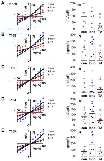 Increase of intracellular Ca2+ by ionomycin activated whole-cell Cl− currents in TMEM16E-, J- and K-CFP-CAAX-expressing HEK293 cells. (A) Current/voltage relationships obtained in non-stimulated mock-transfected HEK293 cells (con), 1 µM ionomycin-treated cells (Iono) and ionomycin-treated cells pre-incubated with 20 µM tannic acid (TA). Summary of corresponding current densities obtained at Vc = +100 mV. (B) Current/voltage relationships obtained in TMEM16E-CFP-CAAX (T16E)-transfected HEK293 cells. Summary of corresponding current densities obtained at Vc = +100 mV. (C) Current/voltage relationships obtained in TMEM16H-CFP-CAAX (T16H)-transfected HEK293 cells. Summary of corresponding current densities obtained at Vc = +100 mV. (D) Current/voltage relationships obtained in TMEM16J-CFP-CAAX (T16J)-transfected HEK293 cells. Summary of corresponding current densities obtained at Vc = +100 mV. (E) Current/voltage relationships obtained in TMEM16K-CFP-CAAX (T16K)-transfected HEK293 cells. Summary of corresponding current densities obtained at Vc = +100 mV. (Number of cells measured), # paired t-test, α < 0.05.