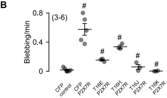 P2X7R are ligand-gated, non-selective cation channels that are activated by high concentrations of extracellular nucleotides, released during inflammation, tissue injury and T-cell activation [33,34]. Activation of P2X7R by high extracellular ATP concentrations induced not only an instantaneous inward cationic current but also pore formation. This pore is non-selective and permeable to molecules up to 900 Da [31,32]. By the work of Ousingsawat et al., it was shown that activation of P2X7R caused Ca2+ influx, which activated—with a delay of seconds up to 2 min—a large whole-cell current and permeation of the fluorescent molecules YO-PRO-1, fluorescein and calcein [35,36,37,38]. Increase in intracellular Ca2+ by the P2X7R activated TMEM16F. TMEM16F was in part responsible for the delayed pore conductance and dye uptake [35]. TMEM16F also participated in many of the essential cellular responses downstream of P2X7R like initial cell shrinkage, membrane phospholipid scrambling, membrane blebbing and apoptosis [35]. Membrane blebbing was defined as a phenomenon in response to elevated intracellular Ca2+, where large membrane-bound vesicles (about 0.5 µm in diameter) protruded rapidly from the cell surface [39,40]. These vesicles were characterized by phosphatidylserines externalized to the outer membrane leaflet [31,32]. Blebbing has been observed during such processes as mitosis, cytokinesis, differentiation and apoptosis [40,41]. Targeting intracellular TMEM16 paralogs to the plasma membrane resulted in a reduction of P2X7R-dependent membrane blebbing induced by 5 mM ATP (Figure 7).