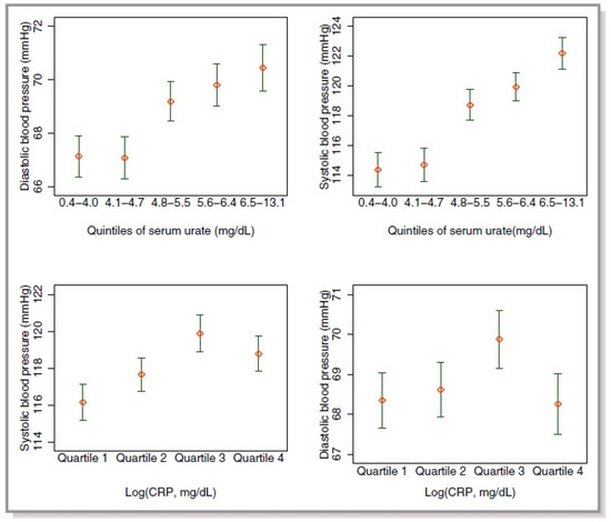 Bivariate associations between log (C-reactive protein), serum urate, and blood pressure. Mean and 95% CIs were calculated using survey weights [11].