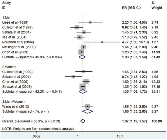 RR and 95% CI from the eligible studies of elevated serum uric acid level and cardiovascular mortality comparing the highest serum uric acid to the lowest category group in a random effect model [15].