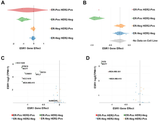 ESR1 essential gene behavior. (A,B) Box-plots showing the ESR1 essential gene score in all BC cell lines screened in Meyers et al. [6] and Behan et al. [7], respectively. A CERES score value ≤ −0.5 indicates a significant effect of the gene knockout. The gray box-plot represents BC cell lines for which no sub-subtype information is available. (C,D) Scatter plots showing the correlation between ESR1 gene effect, indicated as the CERES score, and its expression, indicated as log2 (TPM+1) for all BC cell lines screened in Meyers et al. [6] and Behan et al. [7], respectively.