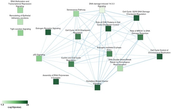 To explore the pathway landscape where potential drivers for ERα+ BC are involved, functional annotation analysis was performed considering the 960 common essential genes, previously obtained comparing Broad and Sanger screening. The top enriched pathways (B-H p < 0.05) show many biological processes relevant in tumorigenesis and cancer progression such as DNA repair mechanisms, cell cycle regulation, epithelial–mesenchymal transitions, DNA methylation, transcriptional repression signaling and senescence pathway as well as, several pathways related to estrogen receptor activity, such as estrogen receptor signaling and estrogen-mediated S-phase entry. These pathways, characterizing the luminal BC phenotype, are listed in Table 3 and displayed as a network, generated using Ingenuity Pathway Analysis and EnrichmentMap, in Figure 2 and involve several essential genes, such as the nuclear respiratory factor-1 (NRF-1), which is a key regulator of mitochondrial gene transcription. It was shown that oxidative stress in hormone-responsive BC cells increases NRF-1 expression and determines a decrease in ERα expression [69]. Moreover, it was observed that NFR-1 phosphorylation is mediated by AKT activation due to the estrogenic increase of ROS levels, contributing to the induction of BC cell growth [70]. Nowadays, more attention is paid to define the role of mitochondria and redox signaling pathways in the cancer cells’ metabolic reprogramming and their apoptotic response to exogenous stressors as therapeutic agents [71]. It has been observed that NRF-1 expression in tamoxifen-resistant BC cells was higher than sensitive BC cells, as well as endocrine-resistant phenotypes associated with a bioenergetics profile much more vulnerable to metabolic stress than endocrine sensitive BC cells. Despite the evidence, the role of NRF-1 in endocrine resistance remains unidentified [72].