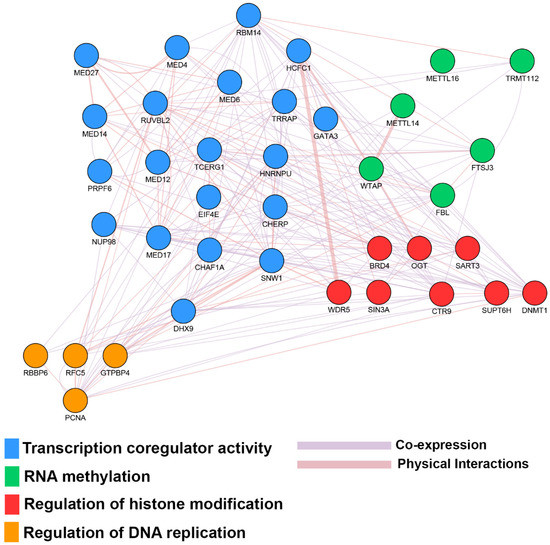 To corroborate the key role of these molecules in the context of hormone-responsive BC, a gene ontology analysis was performed. It showed the engagement of ERα molecular partners and in several biological processes essential for the cell growth, differentiation, survivor, tumor development and chemotherapy resistance. Among these functions, those related to the regulation of DNA replication, the epigenetic modulation of RNA methylation, histone modification and transcriptional coregulatory activity, directly related to estrogen signaling are particularly of interest, as shown in Figure 3.