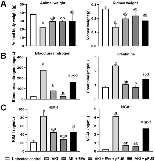 Physiological and biochemical measures of kidney function. (A) Animal body weight and kidney weight. (B) ELISA of blood urea nitrogen (BUN) and serum creatinine. (C) ELISA of molecular kidney injury markers KIM-1 and NGAL. Measurements were taken 9 days following cisplatin treatment. Each group has n = 5 mice. Significant difference a p < 0.05 relative to untreated control; b p < 0.05 relative to AKI; c p < 0.05 relative to AKI + EVs; d p < 0.05 relative to AKI + EVs + pFUS.