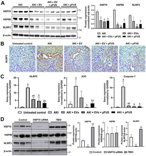 HSP70 regulation of the NLRP3 inflammasome. (A) Western blot and quantification showing the expression of HSP70, HSP90, NLRP3, and β-actin in kidney tissue. (B) Immunohistochemical staining for NLRP3 in kidney tissue. (C) qRT-PCR measurement of inflammasome components NLRP3, ASC, and Caspase-1 expression in kidney tissue, normalized to GAPDH. (D) Western blot and protein quantification showing expression of HSP70, HSP90, NLRP3, and β-actin in human embryonic epithelial (HEK) cells treated with DMSO (control), an HSP70-siRNA, or 7BIO. Each group has n = 3 mice. Significant difference a p < 0.05 relative to untreated control; b p < 0.05 relative to AKI; c p < 0.05 relative to AKI + EVs; d p < 0.05 relative to AKI + EVs + pFUS; * p < 0.05 relative to DMSO control; # p < 0.05 relative to HSP70-siRNA.