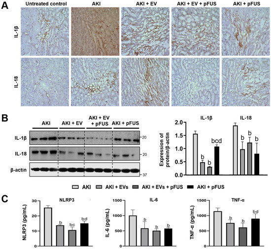 Inflammatory cytokines. (A) Immunohistochemical staining for IL-1β and IL-18 on kidney sections. (B) Western blot and quantification of IL-1β and IL-18, n = 3 for each group. (C) ELISA quantification of serum NLRP3, IL-6 and TNF-α, n = 5 for each group. Significant difference a p < 0.05 relative to untreated control; b p < 0.05 relative to AKI; c p < 0.05 relative to AKI + EVs; d p < 0.05 relative to AKI + EVs + pFUS.