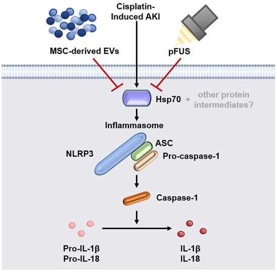We have shown that the pretreatment of kidneys suffering from AKI with pFUS enhances the therapeutic effect of MSC-derived EVs. This synergistic effect is at least in part due to downregulation of HSP70, which in turn reduces the formation of the NLRP3 inflammasome, resulting in the attenuation of the pro-inflammatory environment characteristic of AKI (Figure 4).