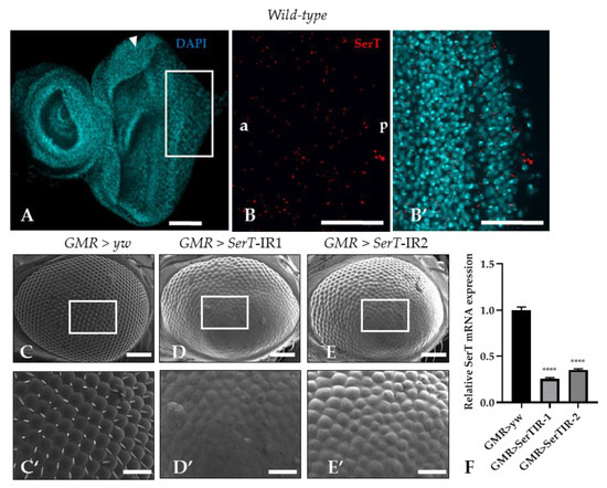Despite multiple studies that explore SerT expression in the central nervous system of Drosophila [25,26], there is no evidence of SerT expression in the imaginal eye discs. In this research, SerT expression was visualized by a specific antibody for Drosophila SerT. Anti-SerT signals were distributed outside of the nucleus throughout the eye imaginal disc, showing high intensity (Figure 1B,B′).