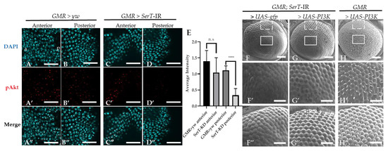 We suspected that the eye phenotype of the SerT knockdown fly might be influenced by the PI3k/Akt pathway. This pathway is well known to be involved in the regulation of the cell cycle, and there is also evidence that suggests its participation in the neurogenesis of the compound eye [22]. First, we visualized the Akt activation level using specific Drosophila anti-phosphorylated Akt at Ser505 (the equivalent of human Ser473). Figure 4A–D” shows a significant decrease in the level of phosphorylated Akt in the posterior region (the region affected by SerT-kd, Figure 4D–D”) of the eye disc of the SerT-kd fly compared with that in the control (Figure 4A–B”) and in the anterior region (the region unaffected by SerT-kd, Figure 4C–C”) of the same eye disc.