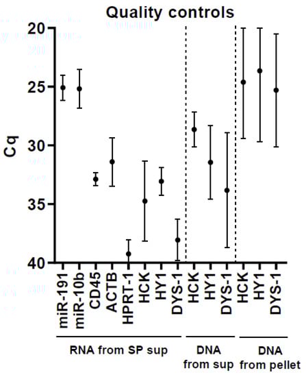 Quality controls to check for contamination in seminal plasma supernatant. To check if the supernatant of the seminal plasma contains sperm cells, somatic cells, and genomic DNA, five seminal plasma samples were processed for RNA extraction and DNA extraction. MiR-191-5b and miR-10b-5p were measured by qPCR on cDNA transcribed for microRNAs. Messenger RNA of CD45, HPRT-1, and ACTB was measured by qPCR on cDNA transcribed for mRNAs. Markers of somatic DNA (HCK) and Y-chromosome-specific DNA (HY, DYS-1) were assessed on cDNA minus-RNA control samples. The genomic markers were also analyzed on DNA obtained from seminal plasma supernatant (“DNA from sup”) and seminal plasma pellet (“DNA from pellet”). Data are represented as means ± SD.