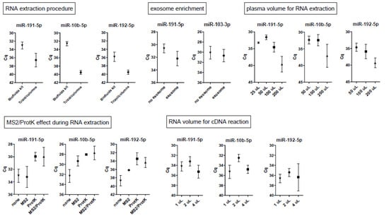 - Mestdagh, P.; Hartmann, N.; Baeriswyl, L.; Andreasen, D.; Bernard, N.; Chen, C.; Cheo, D.; D’Andrade, P.; DeMayo, M.; Dennis, L.; et al. Evaluation of quantitative miRNA expression platforms in the microRNA quality control (miRQC) study. Nat. Methods 2014, 11, 809–815. [Google Scholar] [CrossRef]