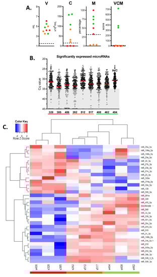 Nine seminal plasma samples were selected that had a total volume between 3 and 6 mL (Figure 3A). For microRNA profiling, we analyzed three normozoospermic samples (VCM > 100; green dots), three samples with asthenozoospermia (<30% motility; orange dots), and three with oligozoospermia (<15 × 106 cells/mL; red dots). The latter two groups had a VCM score < 10. The V, C, M, and VCM scores are depicted in Figure 3A. Levels of 742 microRNAs were determined in each sample. The distribution of Cq value for 236 microRNAs for each sample, which were considered to be significantly expressed, is depicted in Figure 3B. Kruskal–Wallis tests identified 25 microRNAs showing a difference among the three groups of samples with p < 0.1. By Mann–Whitney U testing, 54 microRNAs showed a difference (p ≤ 0.05) between any two groups (Table 2). Thirty-four with the highest fold difference were included in a hierarchical clustering analysis (Figure 3C).
