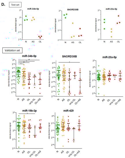 The differences observed for miR-34b-5p in the test cohort could be verified in the validation cohort (Figure 3D): levels in the normozoospermia group were significantly higher compared to the AS group (p < 0.05) and compared to the OL group (p < 0.001). In addition, when the OL group was split up into OL only and OL+AS subgroups, the normozoospermia group was significantly higher. In the whole cohort, miR-34b-5p levels significantly correlated with semen concentration (r = 0.36, p < 0.0005) and motility (r = 0.28, p < 0.01). SNORD38b, miR-20a-5p (both Figure 3D), and miR-204-5p (not shown) were not different between the groups. SNORD38B did show a significant difference between the normozoospermia and OL+AS group (p < 0.05). In contrast to its high expression in the test cohort, miR-26a-5p could not be detected in 66% of samples of the validation cohort and was therefore excluded from further analysis. MiR-19b and miR-429, which have been identified to be related to semen quality in previous studies [5,10,11], did not significantly differ in their level between controls and the OL group. Only when the OL group was split up, the samples with OL only (having normal semen motility) had significantly decreased levels of miR-19b-3p compared to the control group (Figure 3D).