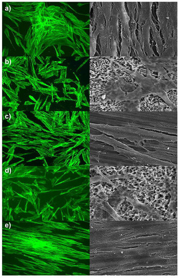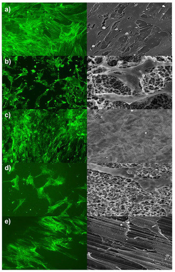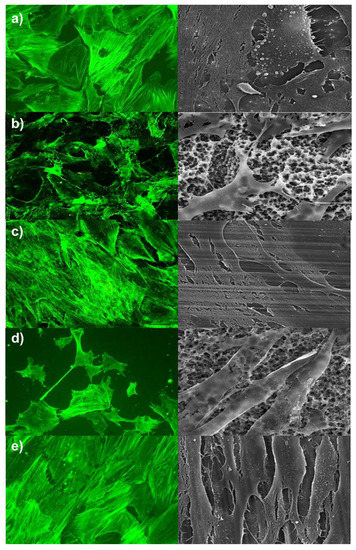 Alterations in the cell morphology of human adipose-derived stromal cells (hADSCs). Left site = f-actin staining, magnification factor 100×; right site = SEM, magnification factor 1200×. (a) Control, (b) rough titanium (Titan-SLA), (c) titanium with a smooth surface texture (Titan-PT), (d) zirconia material (ZrO2-ZLA), and (e) machined zirconia (ZrO2-M).