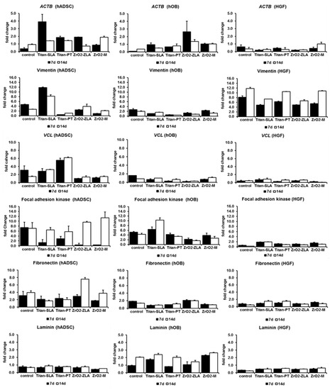 In hADSC, laminin expression remains constant, whereas fibronectin expression increases over time and with the strongest alteration on zirconia material (ZrO2-ZLA™). In HGF cells, both laminin and fibronectin expressions remained constant, which was already confirmed in other studies. Only slight differences in the gene expression of fibronectin was found comparing HGF cells growing on Laser-Lok, titanium, and zirconia surfaces [31]. Further, a significant downregulation of vimentin and fibronectin was found between polished titanium and rough modified titanium/zirconia surfaces [32]. Contrary results were described by Miao et al. (2017). They observed an increased gene expression of laminin, fibronectin, and vinculin in HGF cells growing on titanium with a rough surface texture compared to a smooth surface structure [33]. All three analysed cell types behaved in a varying manner, so that a favoured prediction about hADSC behaviour in comparison to edaphic cells, as hOB and HGF, was not possible.