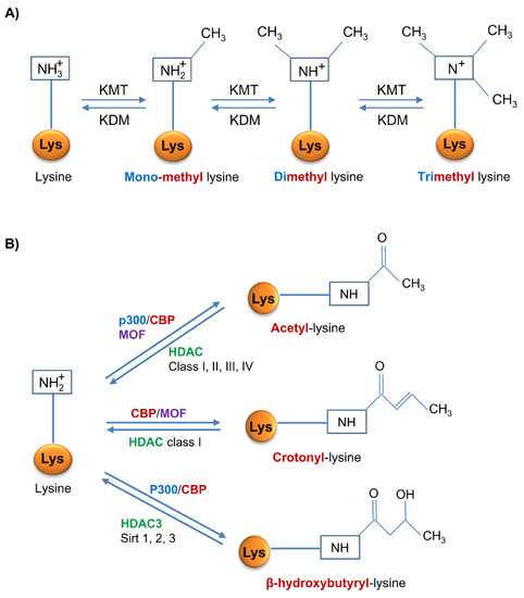 - Tan, M.; Luo, H.; Lee, S.; Jin, F.; Yang, J.S.; Montellier, E.; Buchou, T.; Cheng, Z.; Rousseaux, S.; Rajagopal, N.; et al. Identification of 67 histone marks and histone lysine crotonylation as a new type of histone modification. Cell 2011, 146, 1016–1028. [Google Scholar] [CrossRef]