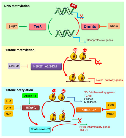 - Fontecha-Barriuso, M.; Martin-Sanchez, D.; Ruiz-Andres, O.; Poveda, J.; Sanchez-Niño, M.D.; Valino-Rivas, L.; Ruiz-Ortega, M.; Ortiz, A.; Sanz, A.B. Targeting epigenetic DNA and histone modifications to treat kidney disease. Nephrol. Dial. Transplant. 2018, 33, 1875–1886. [Google Scholar] [CrossRef]