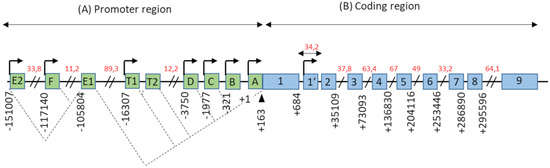 Genomic organization of the ESR1 gene. (A) The promoter region of the ESR1 gene contains 9 non-coding exons (green boxes), annotated from A to F—T1, T2, and 7 alternative promoters each having its own TSS (arrows). There is also a splice acceptor site located at position +163 bp. The dotted lines symbolize the different possibilities for the splicing of non-coding exons, as described in the literature. Exons E1 and T2 expression depends on the promoters E2 and T1, respectively. (B) The coding region of the ESR1 gene consists of 10 exons (blue boxes), numbered from 1–1′to 9, separated by 9 introns. There is also an 8th alternative promoter located at the level of exon 1′. In this schematic representation, the scale is not respected but some estimated positions are indicated below the exons, in base pairs (bp). Position +1 corresponds to the first transcription initiation site (TSS) described by Greene and colleagues, in 1986 [2]. The indications in red correspond to the length of long intronic regions in kilo base pairs (kbp). Adapted from [14,15].