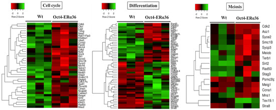 The main biological processes affected by ERα36 expression in mouse fetal testis. Heatmaps showing the expression level of differentially expressed genes involved in «Cell cycle», «Differentiation» and «Meiosis» processes in Oct4-ERα36 C57BL6/J transgenic mice compared to wild-type ones. Cell cycle: 37 genes; Differentiation: 51 genes and Meiosis: 16 genes. Red: down regulated genes vs. green: up-regulated genes. For each experimental condition, 3 biological replicats of independent fetal gonad pools are presented.
