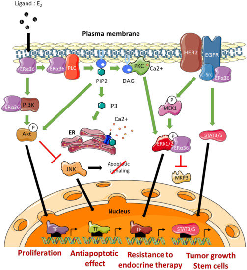 - Omarjee, S.; Jacquemetton, J.; Poulard, C.; Rochel, N.; Dejaegere, A.; Chebaro, Y.; Treilleux, I.; Marangoni, E.; Corbo, L.; Romancer, M.L. The molecular mechanisms underlying the ERα-36-mediated signaling in breast cancer. Oncogene 2017, 36, 2503–2514. [Google Scholar] [CrossRef]