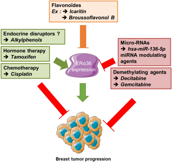 Thiebaut and colleagues [84] identified 12 micro-RNAs that target ERα36 but not the 3′-UTR region of ERα66. They focused on hsa-miR-136-5p, the expression of which is two-fold lower in the serum of breast cancer patients than in healthy people. Moreover, the expression of this micro-RNA is inversely correlated with the stage/grade and the metastatic potential of tumors and mammary cell lines. Hsa-miR-136-5p is also described for its tumor suppressor role in the context of prostate cancer, renal carcinomas, pulmonary adenocarcinomas or osteosarcomas [91,92,93,94,95].