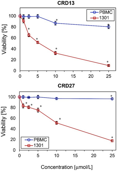 The effect of ruthenium-terminated carbosilane dendrimers (CRD) on viability of peripheral blood mononuclear cells (PBMCs) and 1301 cells after 24 h treatment. The values are mean ± SD of n ˃ 6. * Statistically significant differences compared to the control cells (* p < 0.05).