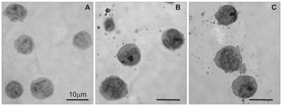 Light microscopy of semi-thin sections of 1301 cells: (A) untreated cells, (B) cells treated with CRD13 dendrimer at 2.5 µmol/L, (C) cells treated with CRD27 dendrimer at 5 µmol/L. Scale bar = 10 µm.