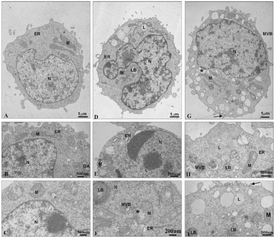 Ultrastructural changes in 1301 cells (A–C). Cells influenced by CRD13 at 2.5 µmol/L (D–F) or CRD27 at 5 µmol/L (G–I). Abbreviations: N—nucleus. Nu—nucleolus. M—mitochondria. MVB—multi-vesicular bodies. LB—lamellar bodies. L—lipids. GA—Golgi apparatus. ER—endoplasmic reticulum. *—vesicle containing CRD dendrimers.