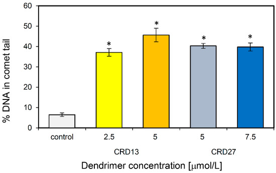 DNA (%) in the comet tail of the control cells and of 1301 cells treated with different concentrations of CRD13 and CRD27 dendrimers. Fifty cells were analyzed in each treatment. The values are the mean ± SD of three independent experiments. *Statistically significant differences from the control cells (* p < 0.05).