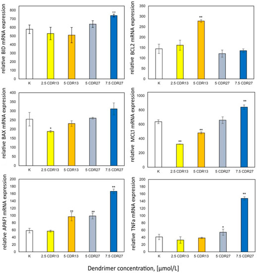 Apoptosis is regulated by Bcl-2 protein family members. Therefore, the expression of pro- and anti-apoptotic proteins was analyzed (Figure 5). The results show decreased expression of Mcl-1 and BAX in 1301 cells after incubation with low concentrations of CRD13 dendrimer; higher concentrations led to increases in Mcl-1 and BAX expression to values close to those in control cells. The Bcl-2 and APAF1 levels also increased. In cells treated with CRD27, TNFα, APAF1, BAX, BID, and Mcl-1 were expressed, each to a level higher than the value when the dendrimer concentration was 7.5 μmol/L.