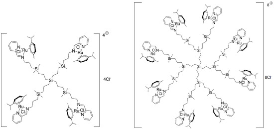 The chemical structures of 1st and 2nd generation carbosilane metallodendrimers, based on arene ruthenium (II) complexes (CRD13 and CRD27) coordinated to iminopyridine surface groups, are illustrated in Figure 6. The main characteristics and synthesis of the dendrimers were described previously [11,15].