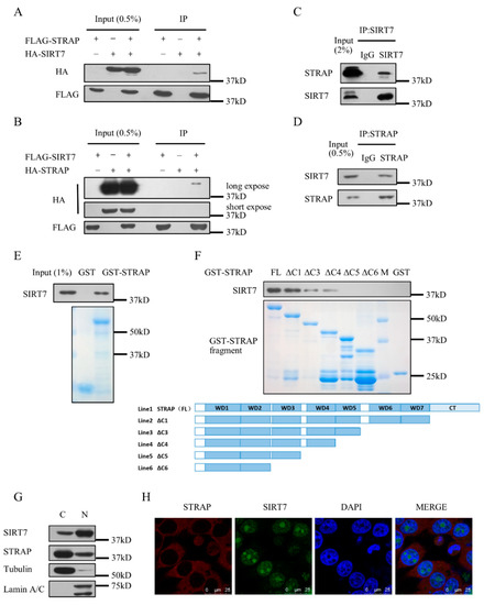 In our previous report, we purified the SIRT7 complex by immunoprecipitation and mass spectrometry. STRAP was found in the complex [29]. To verify the interaction between STRAP and SIRT7, we overexpressed tagged STRAP and tagged SIRT7 into HEK293T cells and performed co-immunoprecipitation (Co-IP) assays. The results showed that SIRT7 can interact with STRAP (Figure 1A), and vice versa (Figure 1B). STRAP–SIRT7 interaction was further supported by the Co-IP of endogenous STRAP and SIRT7 (Figure 1C,D). To confirm this interaction, we purified Glutathione S-transferase (GST) fusion proteins of full-length STRAP (WT) and different GST-tagged truncation of STRAP as indicated (Figure 1F). STRAP was divided into five segments according to its domains: ΔC1 (NT-WD7), ΔC3 (NT-WD5), ΔC4 (NT-WD4), ΔC5 (NT-WD3), ΔC6 (NT-WD2). SIRT7 can clearly be pulled down by GST-STRAP full length (Figure 1E). SIRT7 can also be pulled down by GST-STRAP (ΔC1), not GST-STRAP (ΔC3) or GST-STRAP (ΔC4) as strong as GST-STRAP (FL), indicating that SIRT7 mainly interacts independently and directly with STRAP at the WD region (Figure 1F). According to the reports, STRAP is mainly present in the cytoplasm, and SIRT7 is mainly present in the nucleus. We confirmed the subcellular localization of SIRT7 and STRAP in HCT116 cells by biochemical fractionation assay. STRAP was mainly present in the cytoplasm (C) but was also present in the nuclear fractions. Furthermore, SIRT7 was detected not only in the nucleus (N) but also in the cytoplasmic fractions (Figure 1G). We further performed immunofluorescence assay to detect subcellular localization of STRAP and SIRT7. Co-localization of STRAP and SIRT7 was observed in both cytoplasm and nucleus (Figure 1H). These results provide evidence that SIRT7 interacts with STRAP both in vivo and in vitro.
