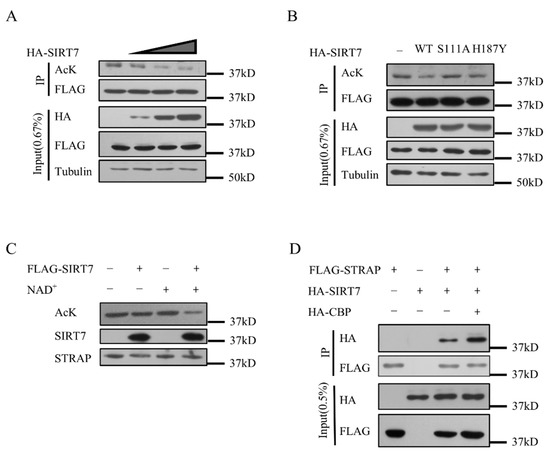Based on the previous results, we then explored whether SIRT7 deacetylates STRAP. We first co-transfected Flag-STRAP and different amounts of HA-SIRT7 into HEK293T cells. Western blotting showed that STRAP acetylation levels decreased with increasing amounts of SIRT7 transfection (Figure 3A). We then performed the in vitro deacetylation assay to confirm whether SIRT7 directly deacetylates STRAP. Acetylated STRAP was purified and incubated under different conditions.