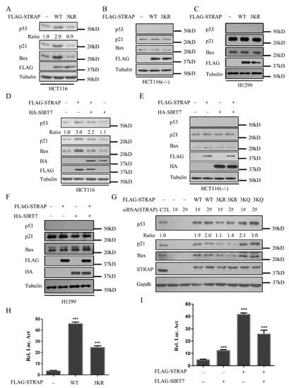 To explore the role of STRAP acetylation in the regulation of p53-mediated signaling pathway, HCT116 (wild-type), HCT116 (p53 -/-), and H1299 cells were transfected with STRAP-WT (WT) and STRAP-3KR (3KR), respectively. In HCT116 cells, expression of STRAP-WT caused the obvious upregulation of p53 as well as its targets, including p21 and Bax. Conversely, STRAP-3KR decreased this effect (Figure 4A). However, this effect was abolished in HCT116 (p53 -/-) and H1299 cells (Figure 4B,C). The above results indicated that the STRAP acetylation plays a key role in stimulating p53 activity. Similar results were also obtained with HCT116 (wild-type), HCT116 (p53 -/-), and H1299 cells that transfected with or without STRAP-WT (WT)/SIRT7 (Figure 4D–F). These results indicated that SIRT7 mediated STRAP deacetylation decreases p53 activity. Consistently, p53, p21, and Bax expression were reduced with the transfection of STRAP-specific siRNA. However, the levels of p53, p21, Bax expressions were back various degrees by transfection with STRAP-WT, STRAP-3KR, or STRAP-3KQ (Figure 4G). We also performed luciferase assay to confirm that STRAP acetylation levels regulate the p53-mediated transcription. Similar to the Western-blotting results, STRAP-3KR, as well as STRAP deacetylated by SIRT7, reduced the upregulation of p53 relative to STRAP-WT (Figure 4H,I). Together, these data indicated that SIRT7 mediated STRAP acetylation levels influence p53 activity.