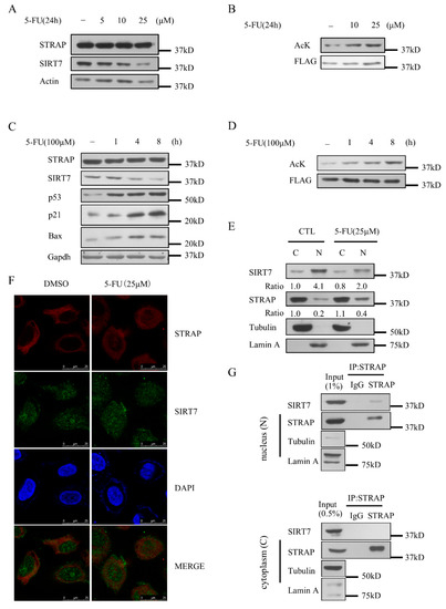 A recent report showed that 5-fluorouracil (5-FU) induces radio-sensitivity via SIRT7 degradation, which promotes cell death during cancer cell radiotherapy [30]. To analyze the effect of 5-FU on STRAP, we first exposed HCT116 cells to 5-FU and analyzed the protein expression levels of SIRT7 and STRAP. SIRT7 levels decreased in a time and dose-dependent mode upon 5-FU treatment, whereas there was no marked change in STRAP following any of the treatment conditions (Figure 6A,C). We next explored whether STRAP acetylation was regulated by 5-FU. 5-FU treatment resulted in time- and dose-dependent induction of STRAP acetylation (Figure 6B,D). These results suggest that 5-FU increased the acetylation levels of STRAP and had no effect on the expression of STRAP. Combining these results, we confirmed the subcellular localization of SIRT7 and STRAP in U2OS cells upon 5-FU treatment by biochemical fractionation assay [31]. We observed that 5-FU treatment led to an increase in STRAP and a decrease in SIRT7 in the nuclear fraction (Figure 6E). The subcellular distribution of STRAP and SIRT7 upon 5-FU treatment was further validated by immunofluorescence assay. We observed the co-localization of STRAP and SIRT7 in both cytoplasm and nucleus (Figure 6F). We confirmed the STRAP–SIRT7 interaction in the nucleus (N) and cytoplasm (C) by biochemical fractionation assay upon 5-FU treatment (Figure 6G). Taken together, 5-FU treatments increased the acetylation levels of STRAP, without affecting its protein levels and influenced the subcellular distribution of STRAP.